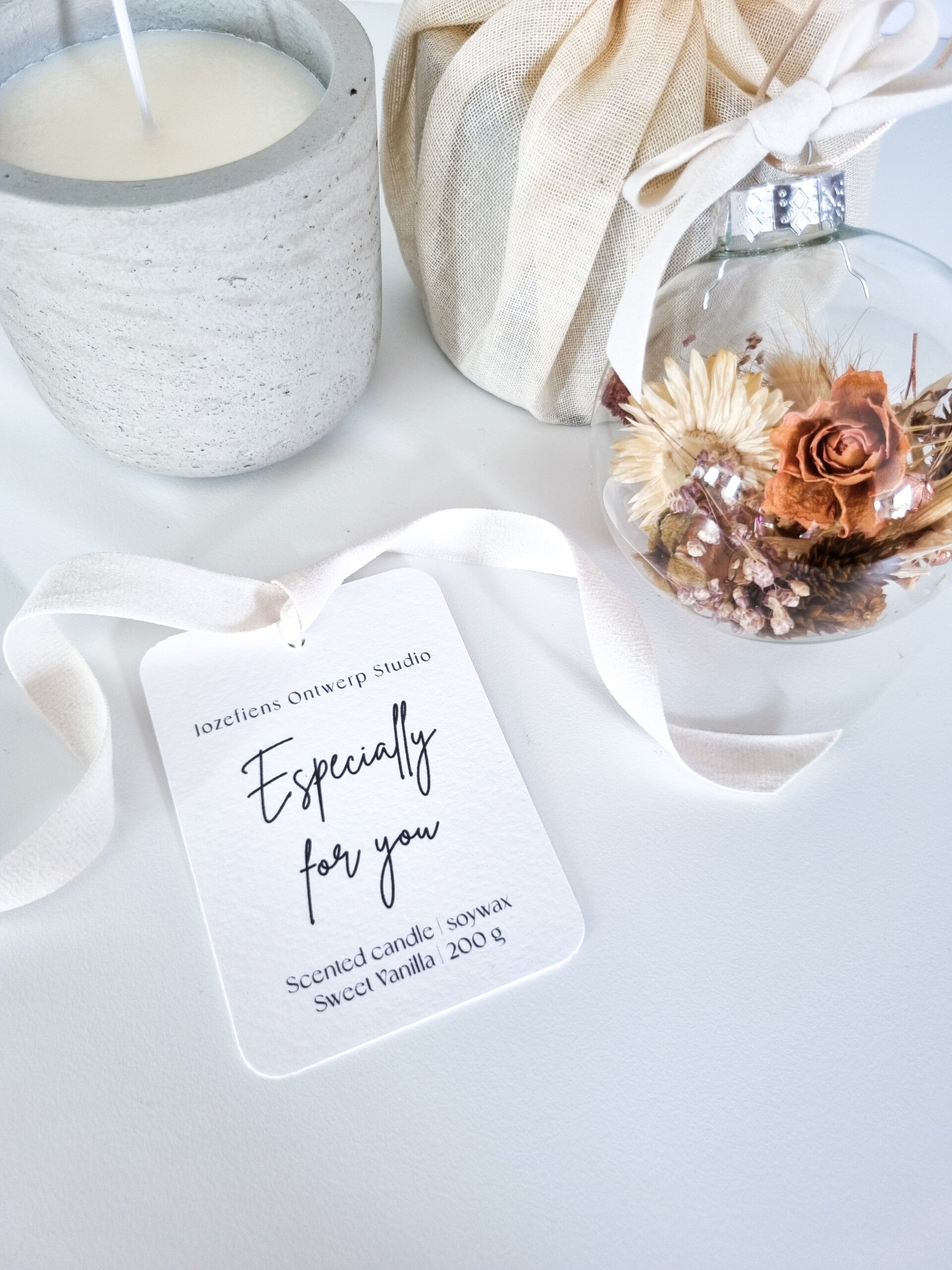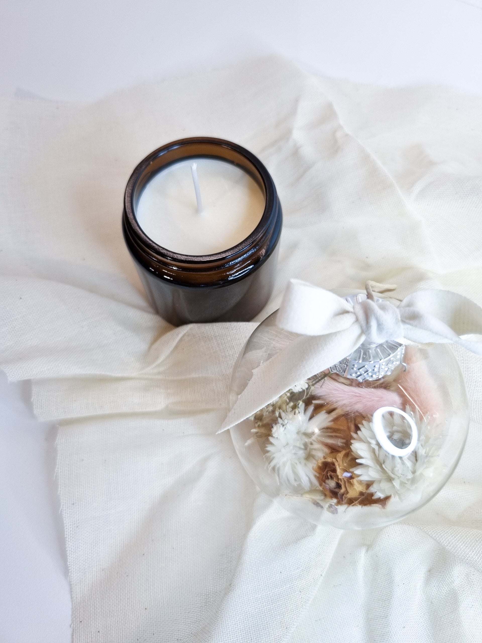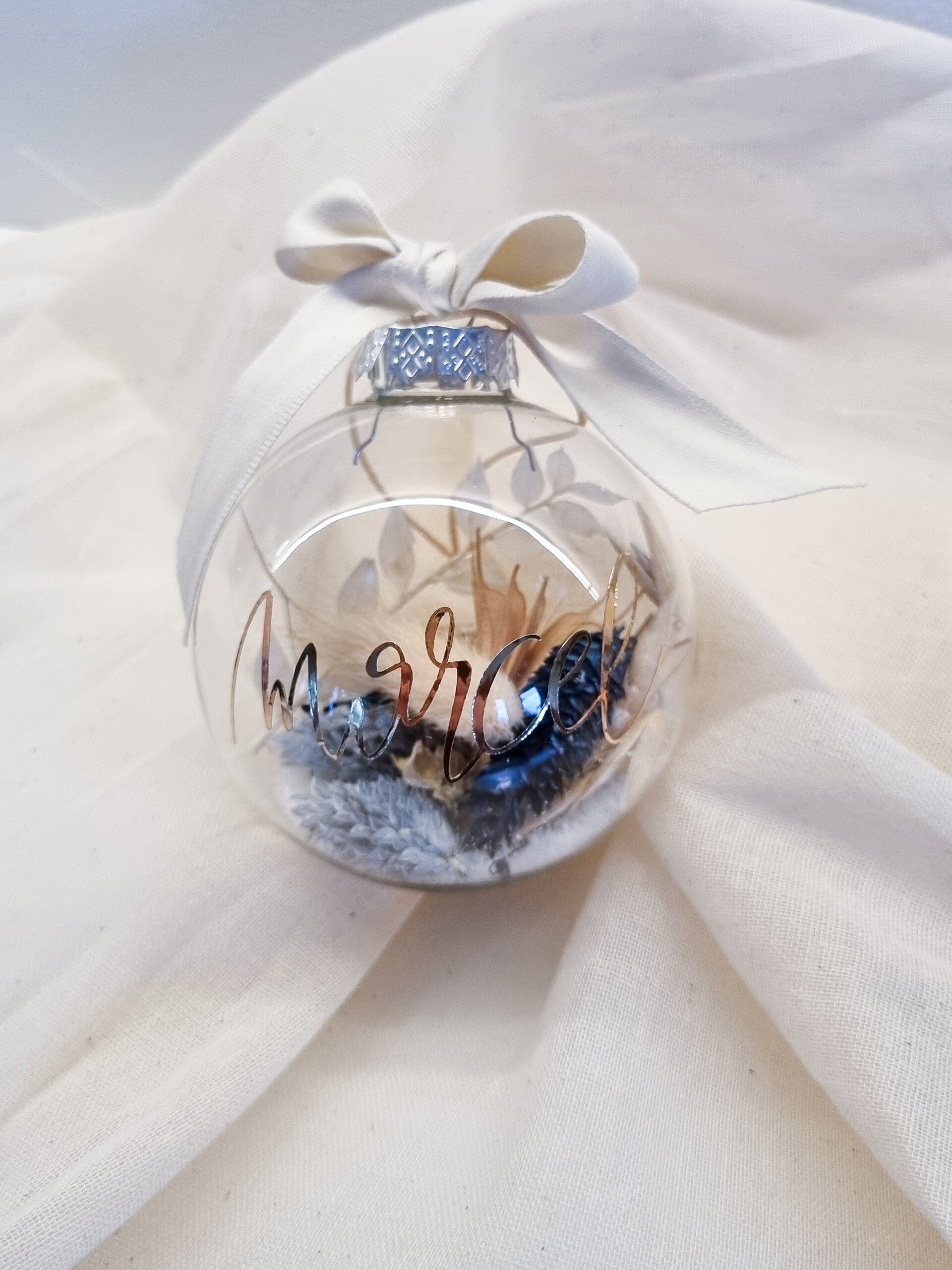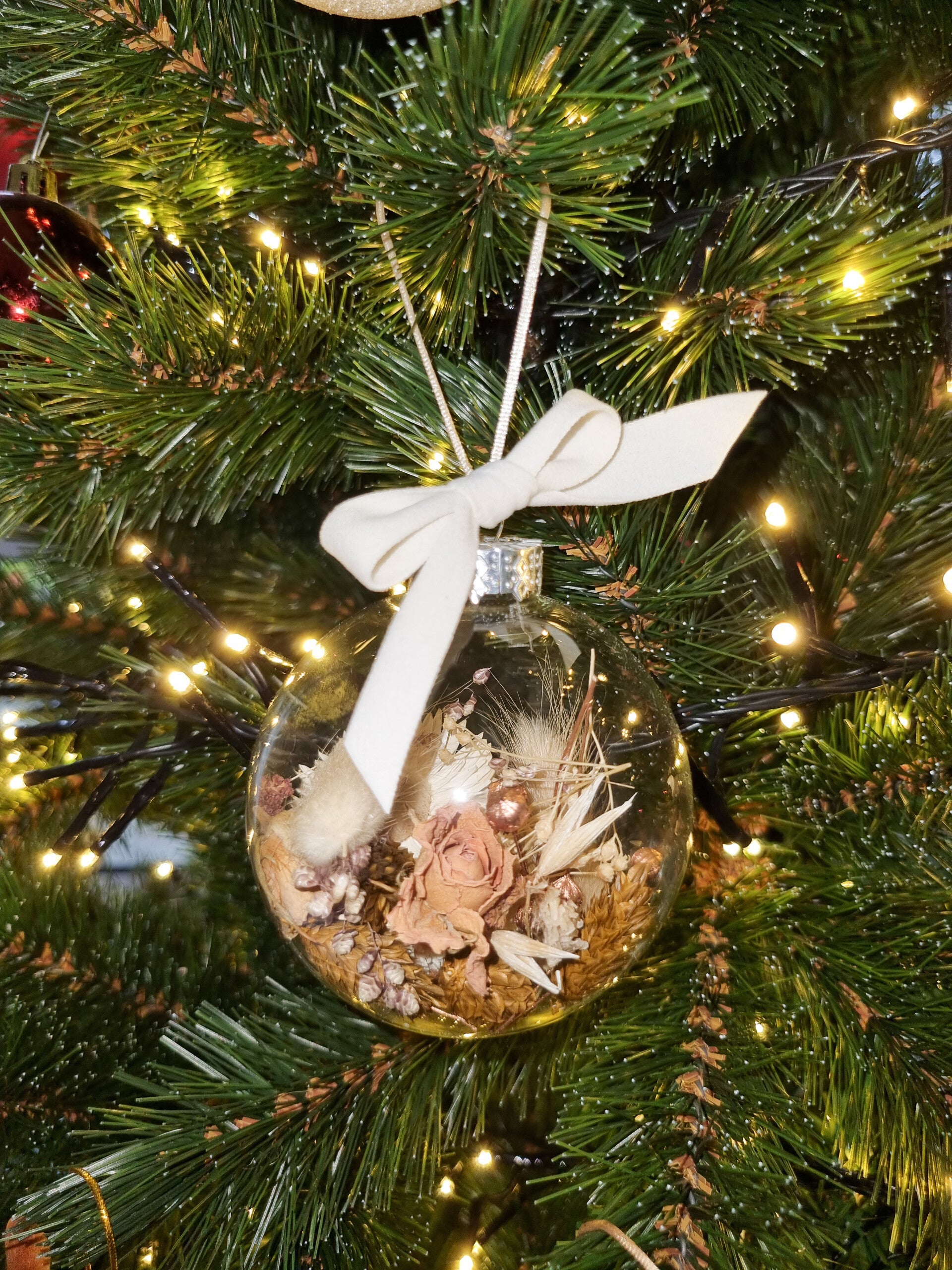- Een glazen kerstbal gevuld met droogbloemen in een kleur naar keuze.
