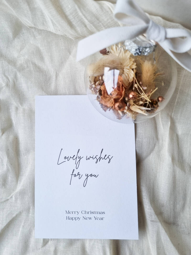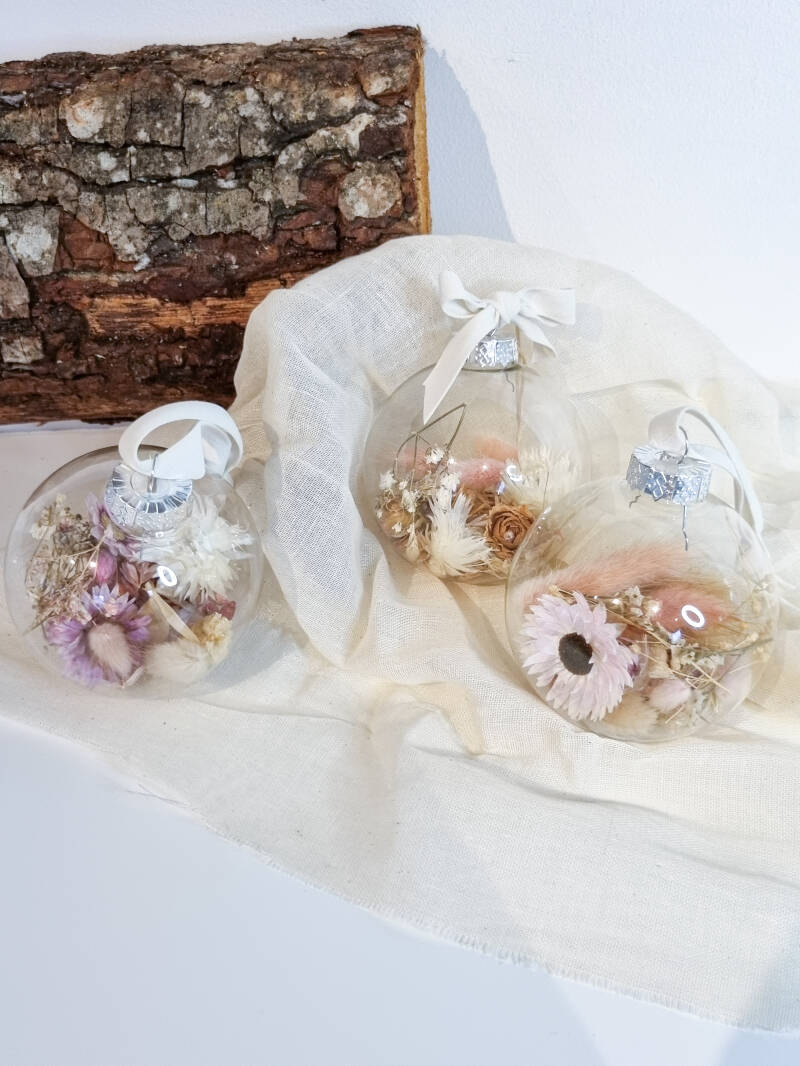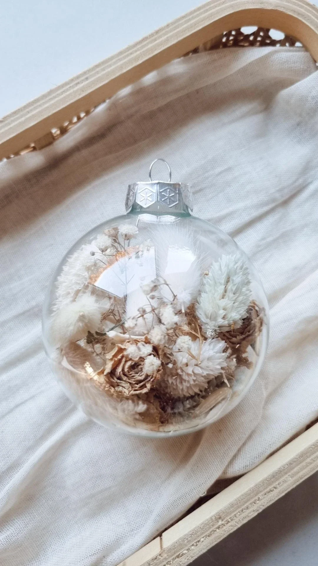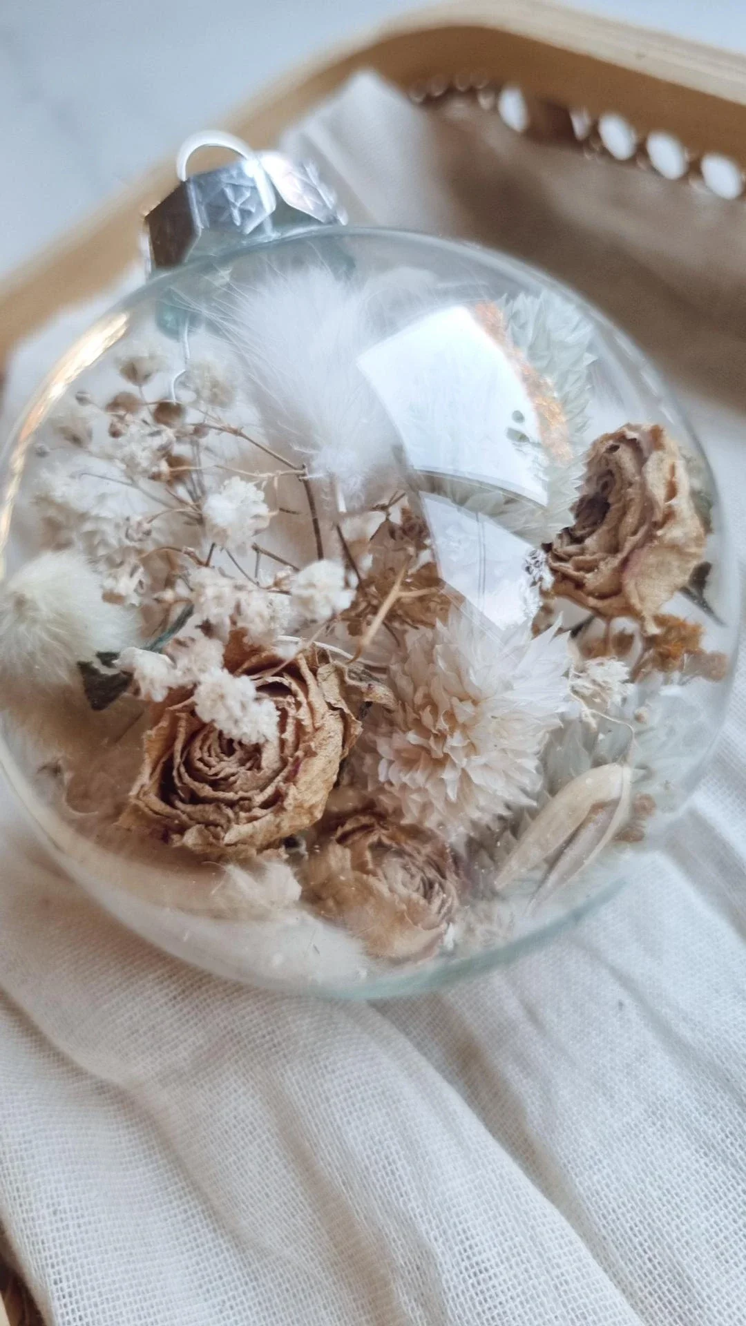 - Een glazen kerstbal gevuld met droogbloemen in een kleur naar keuze.
