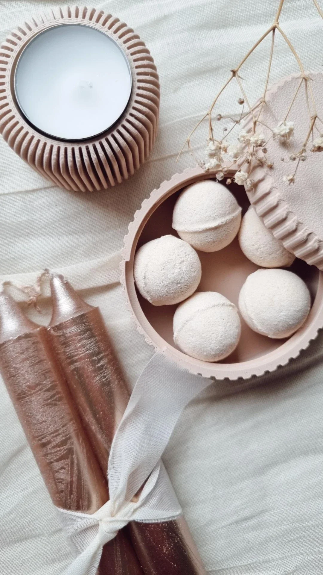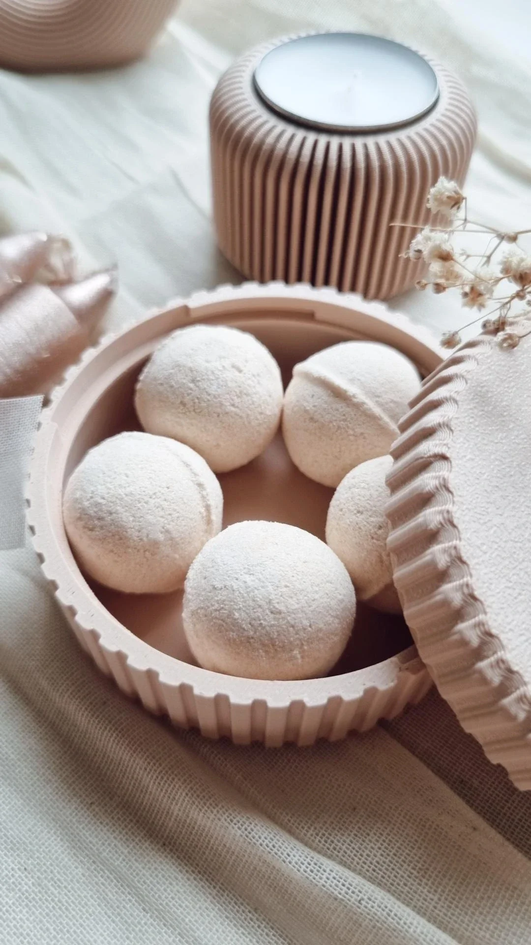 - Een rond beige potje gevuld met 5 artisanale handmade bath bombs.