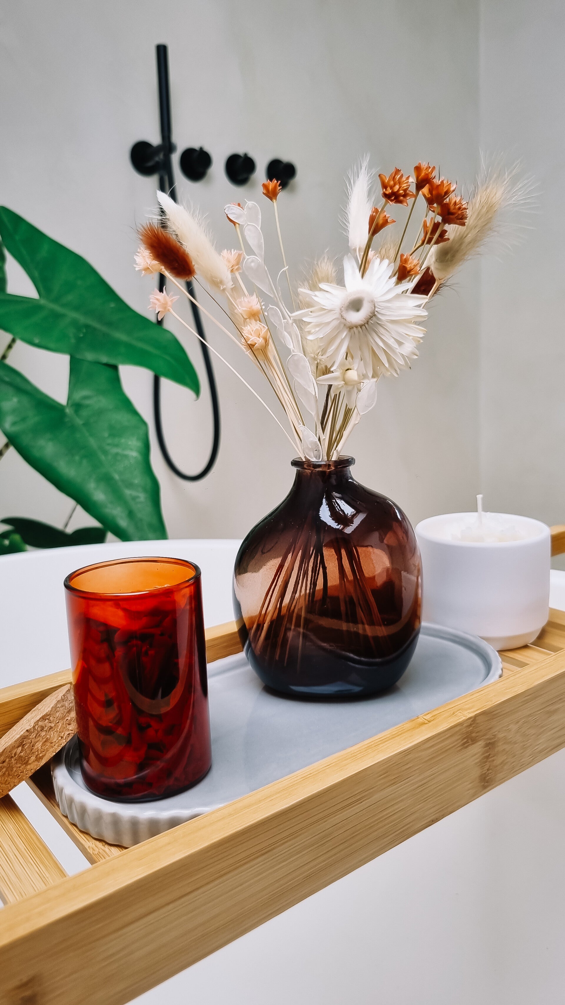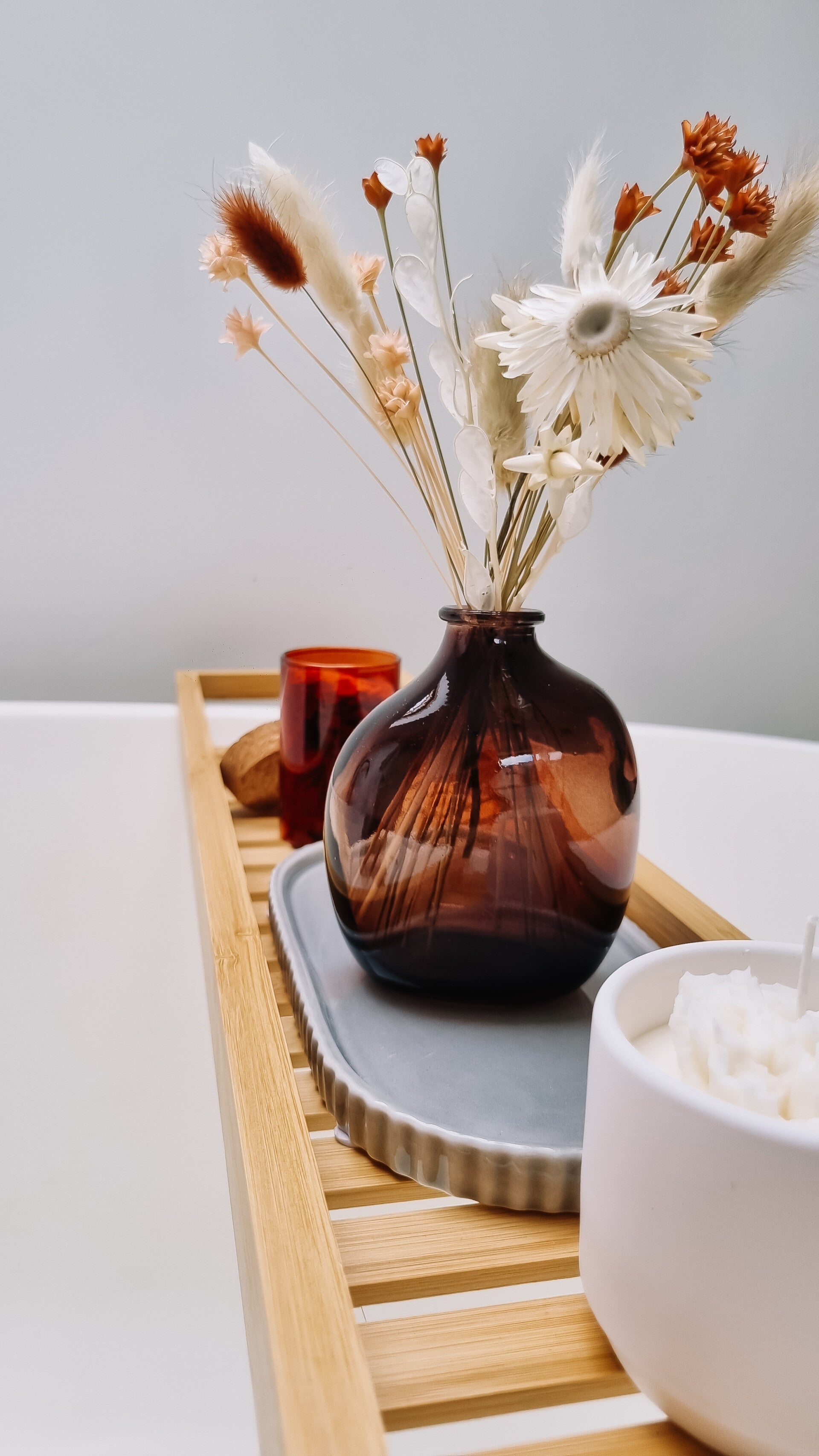 - Vaasje amberkleurig met droogbloemen