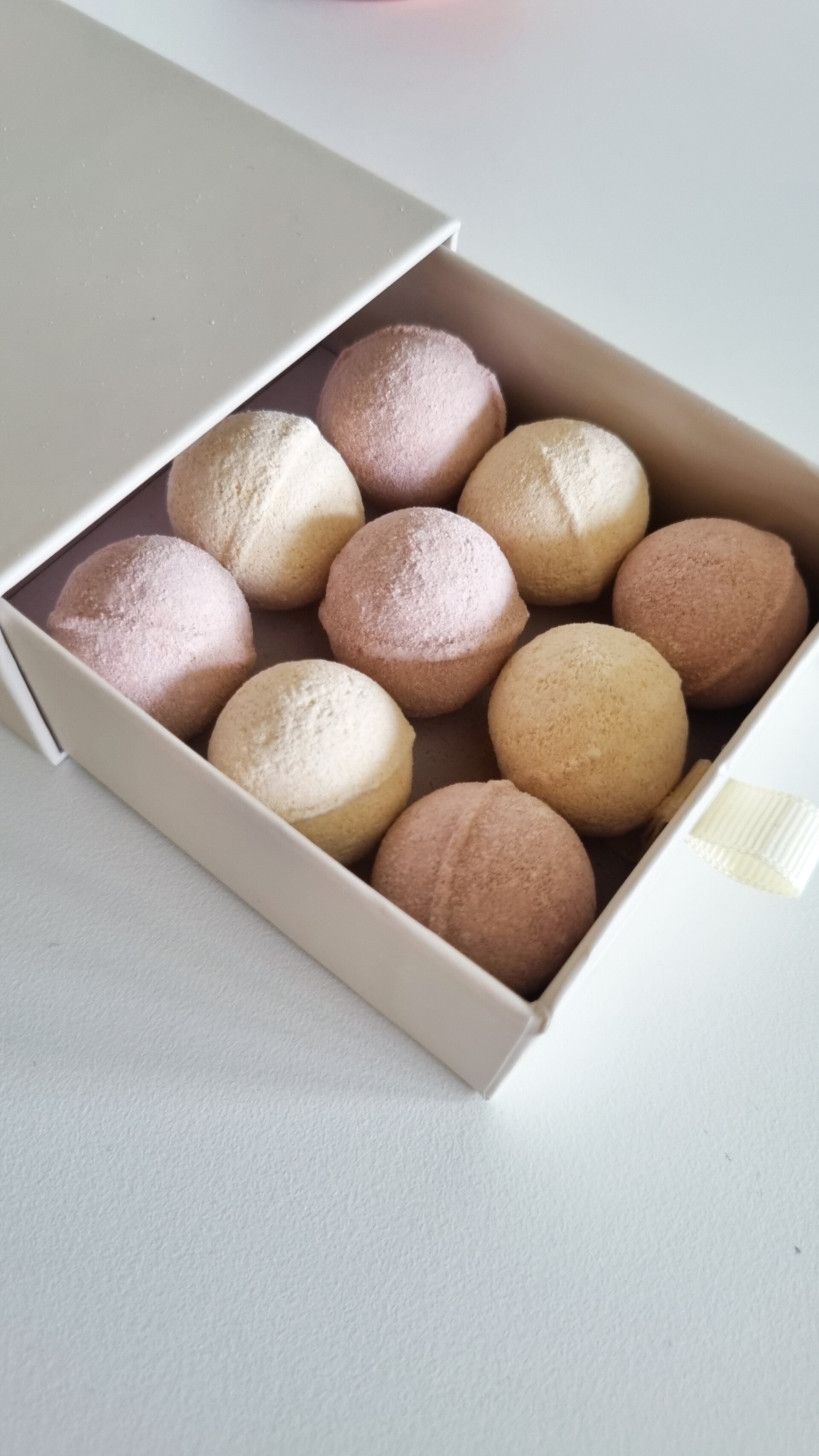 - Een beige luxe schuifdoosje gevuld met 9 mini bruisballen: een assortiment van twee geuren: Vanille Cookies & Chocolate.