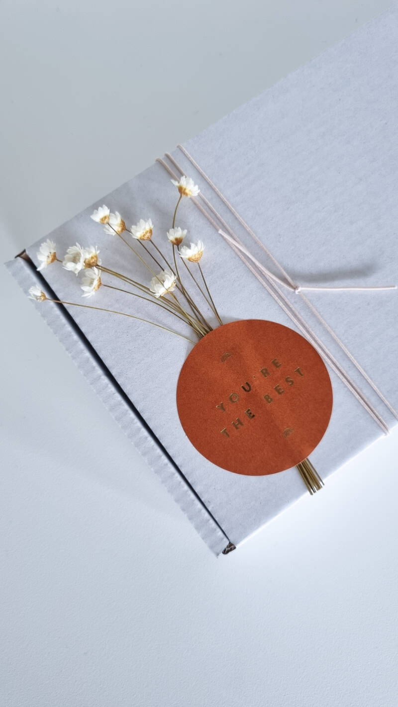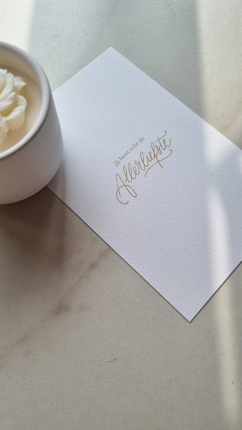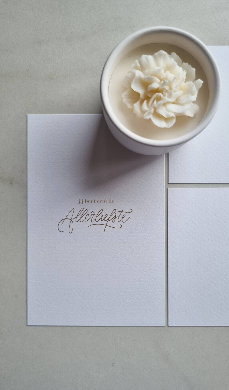 - Optie: Indien gewenst wordt de kaart afgewerkt met droogbloemen en zijden lint van La Lettre Kalligrafie.