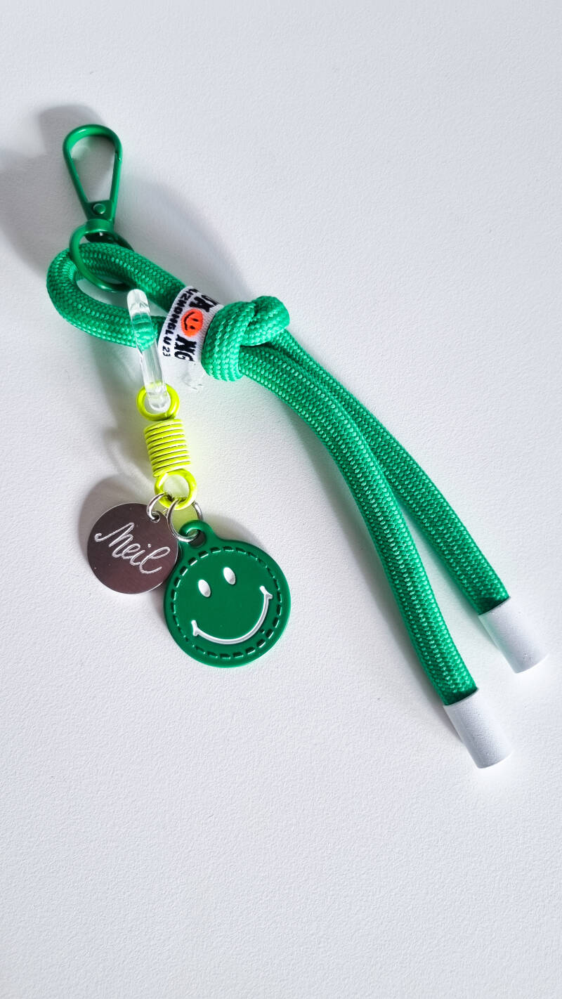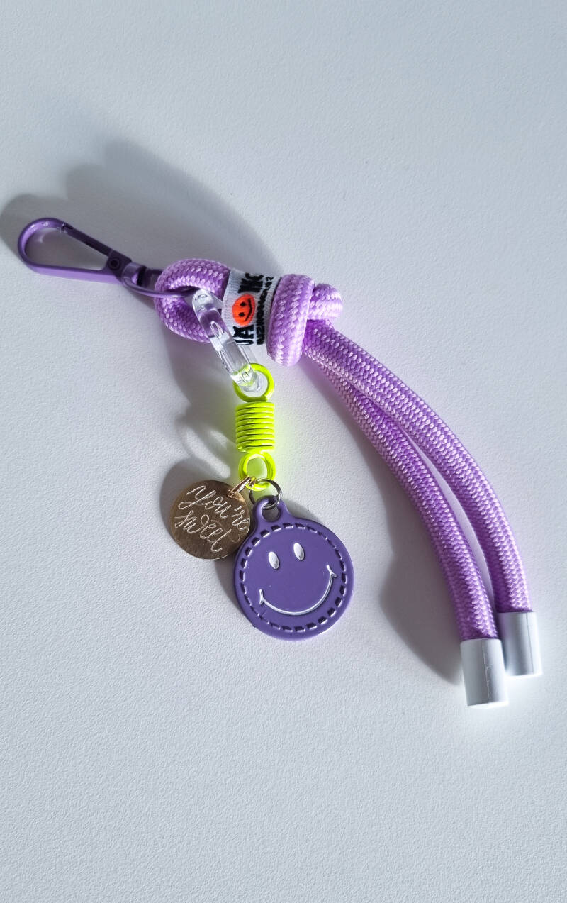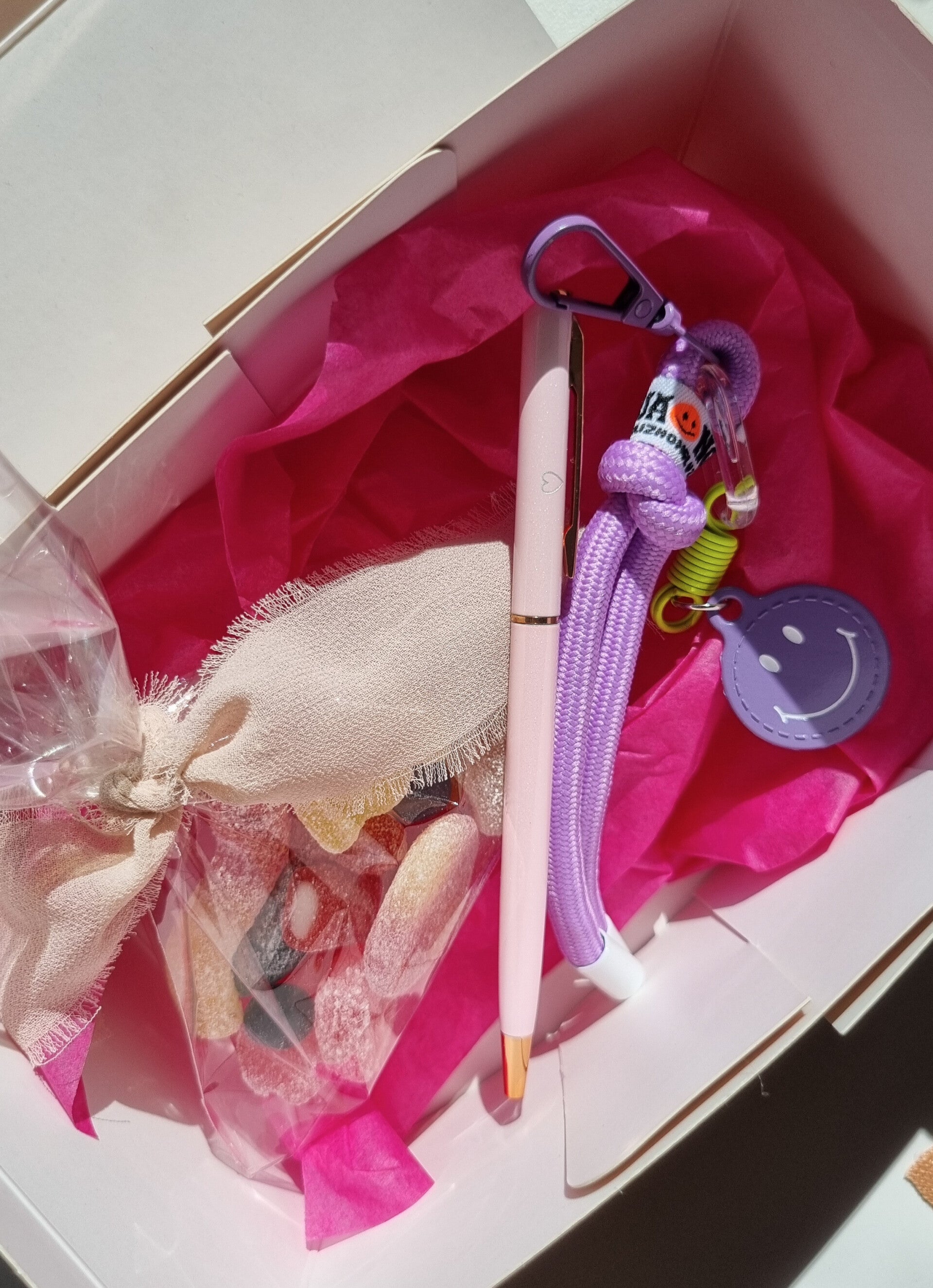 Deze Smile box bevat een sleutelhanger met gravure en een zakje snoep in vrolijke kleuren.