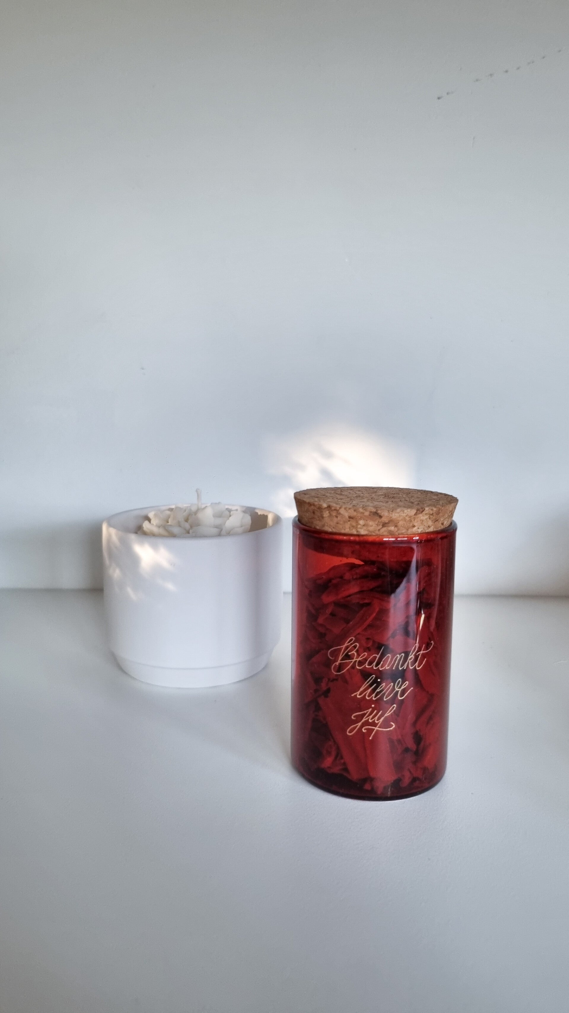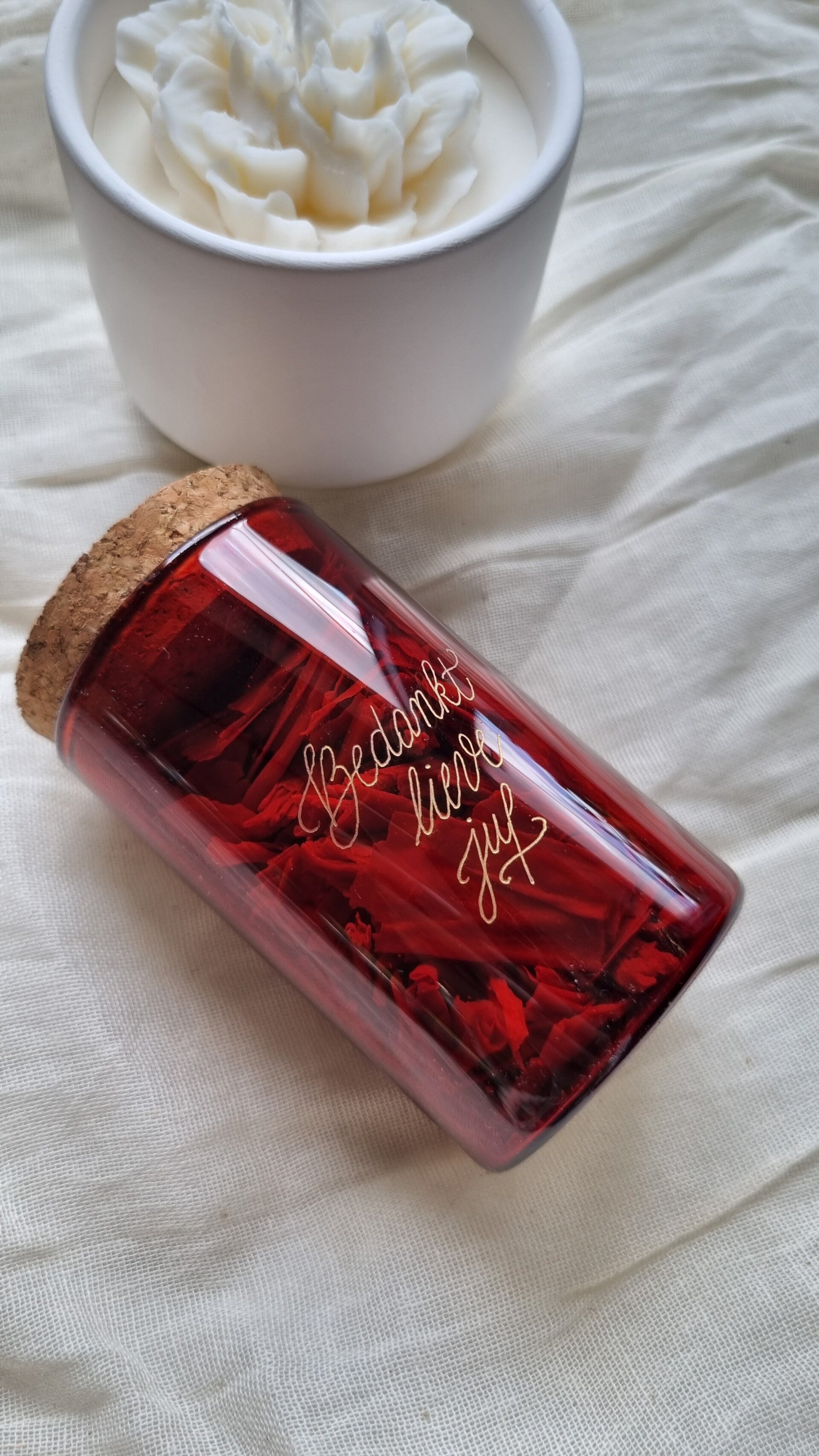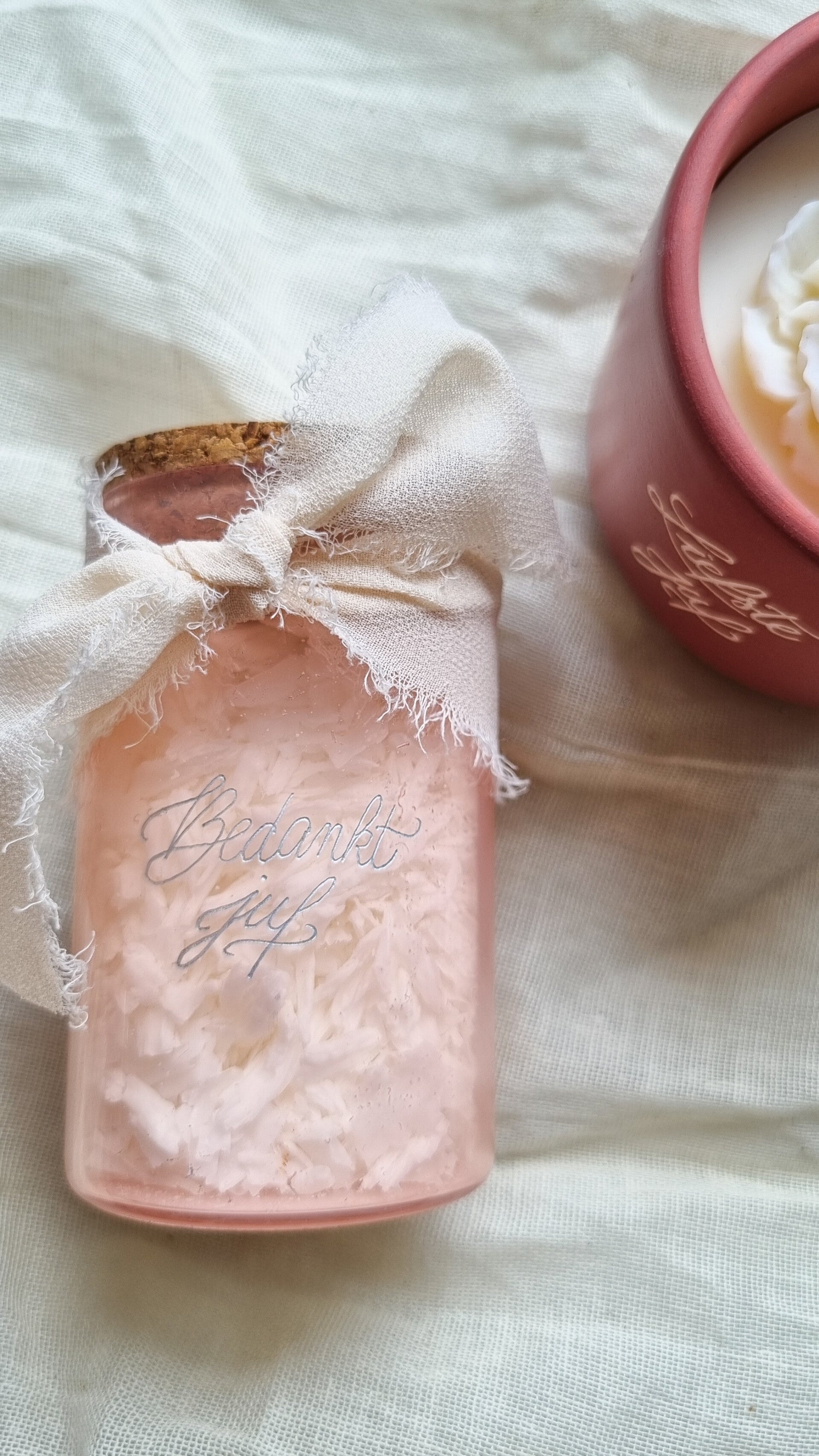 - Zeepvlokken met de geur van Cotton(terraroze kaars) of Cotton & Red berry (witte kaars) voor een zalig zomers bad. Verpakt in een glazen potje met kurk (8x5 cm) + gravure.