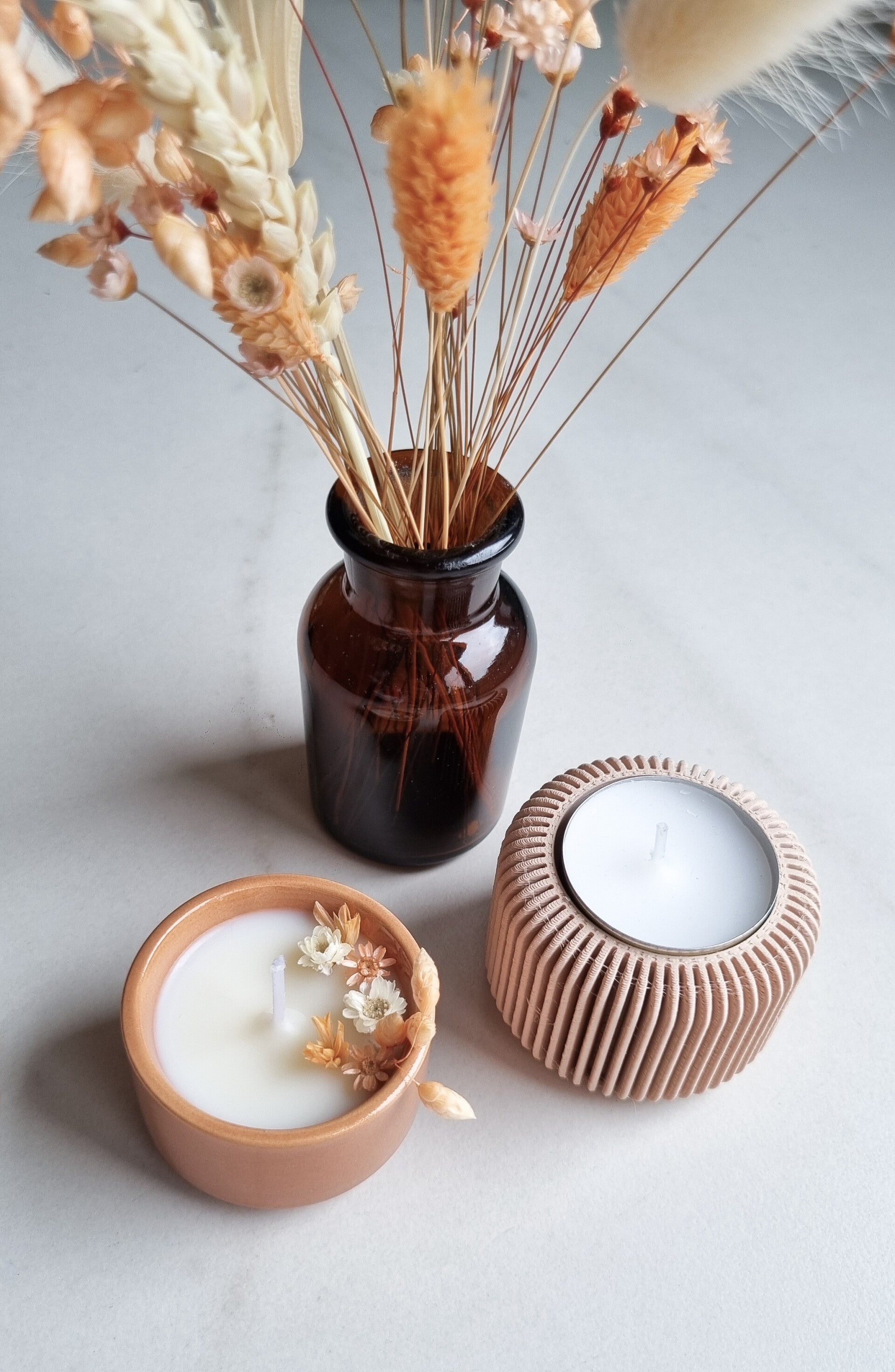 - Vaasje droogbloemen: amberkleurig, afmetingen: H zonder dop 8 cm x Ø 4.5 cm.