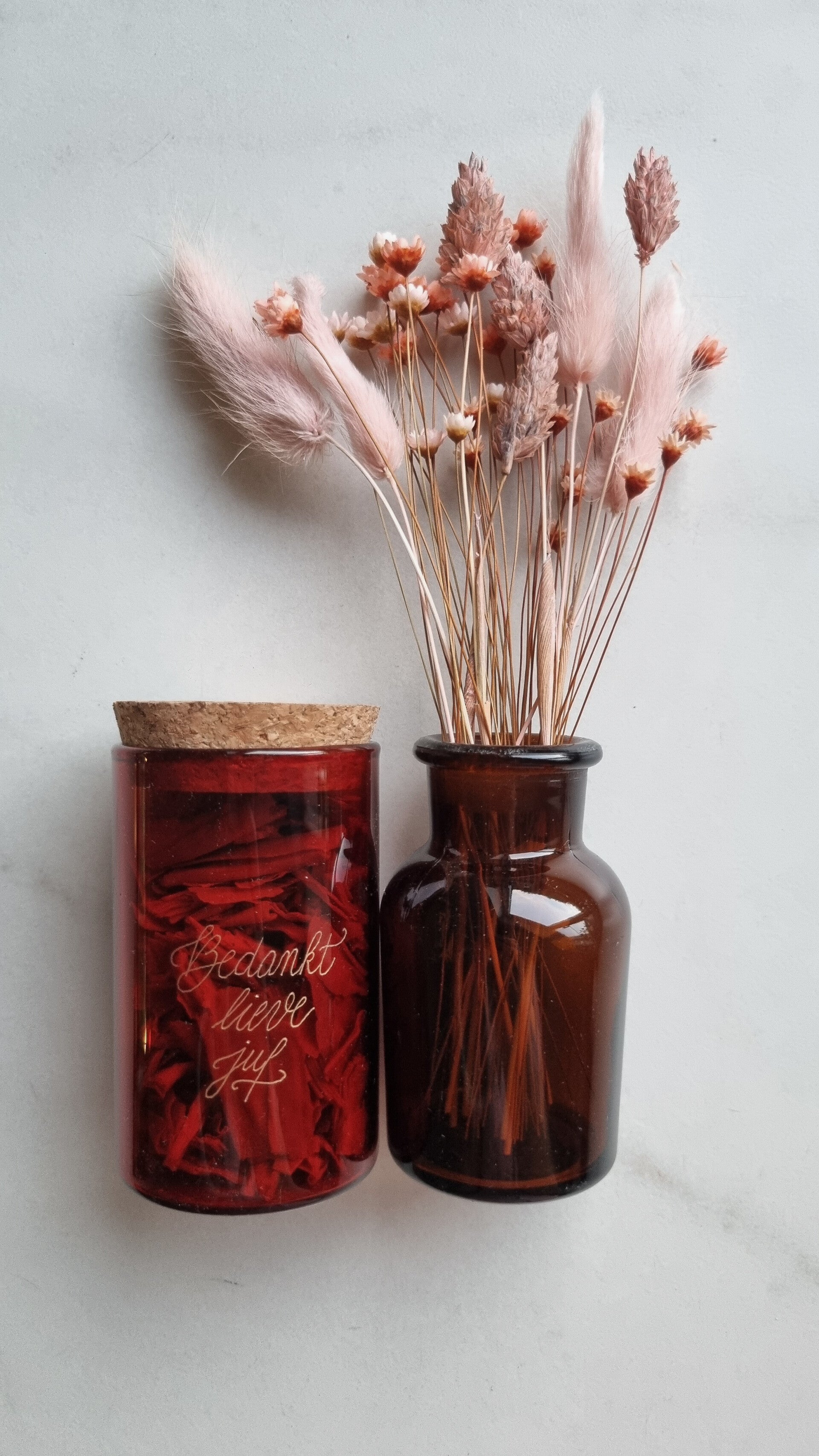 - Vaasje incl. droogbloemen: H 8 cm (zonder dopje), diameter 4.5 cm.