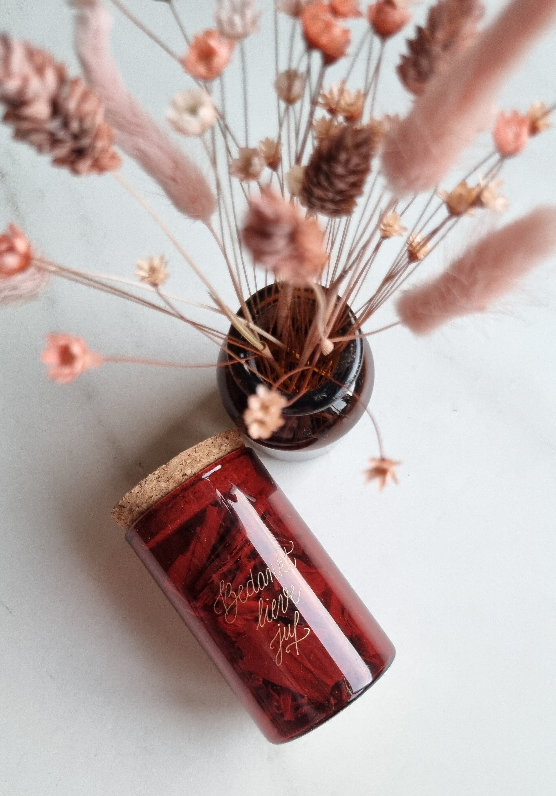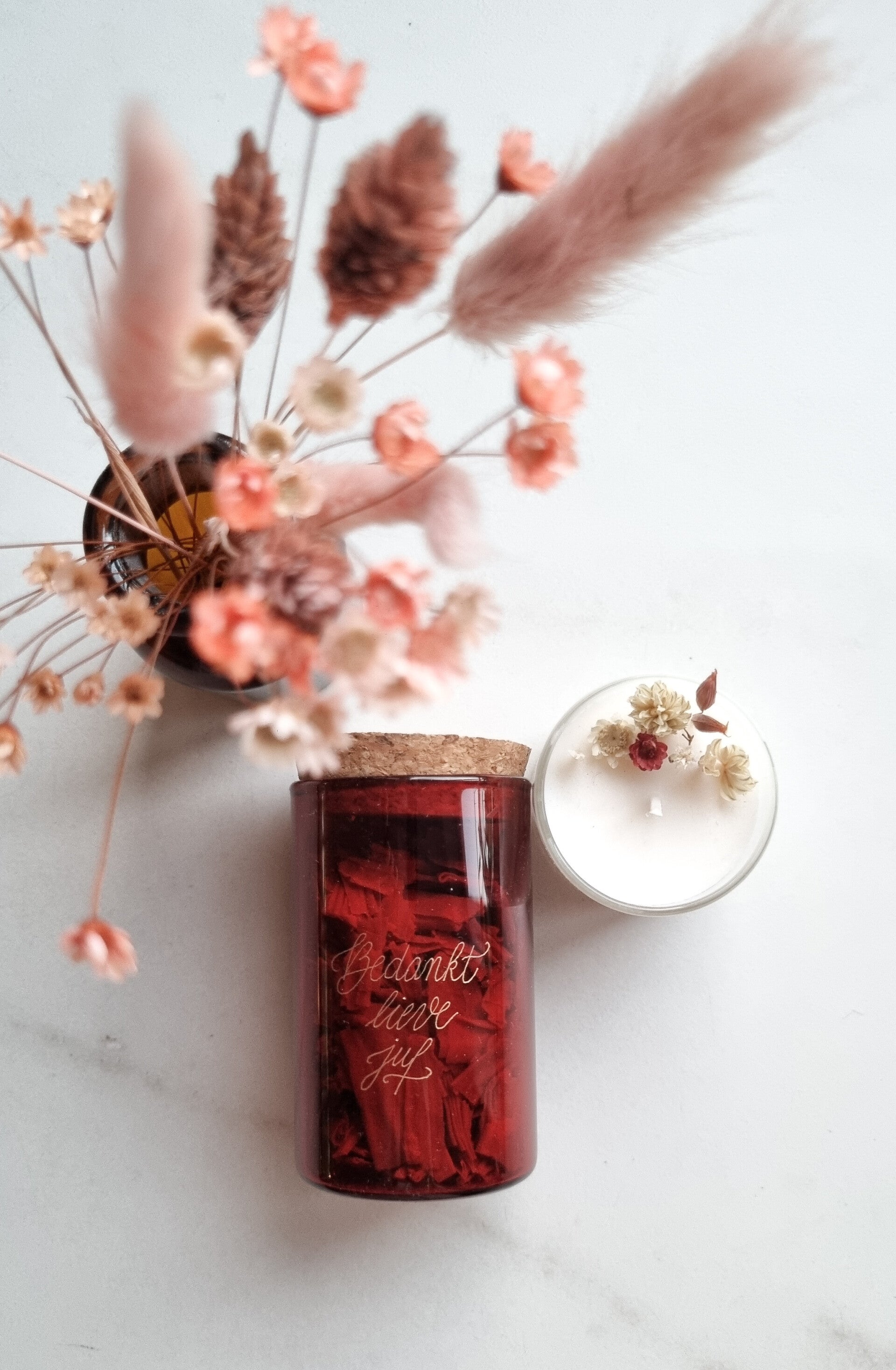 SOAP prise doosje met daarin een vaasje met droogbloemen,een glazen potje gevuld met zeepvlokken en afgewerkt met een gravure, optioneel een klein kaarsje met droogbloemen.