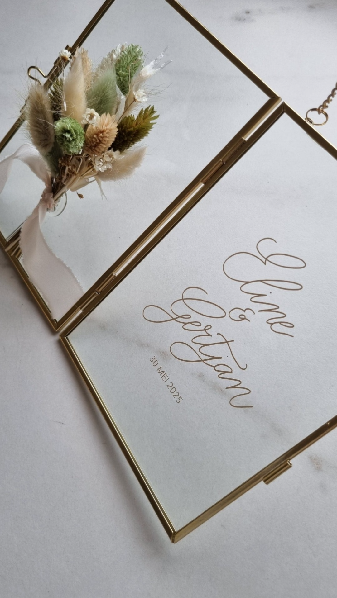 Welke tekst wens je op de frame? Mogelijk opties: namen, initialen, datum, korte quote.