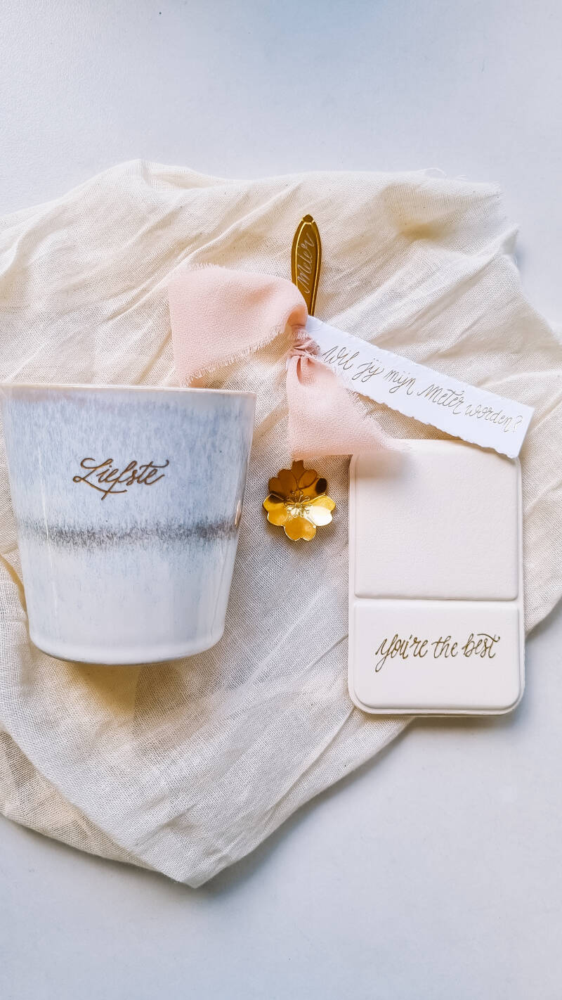 - Beige mok met accent of beige mok met zwart accent (230 ml) incl. gravure van max. 3 woorden.