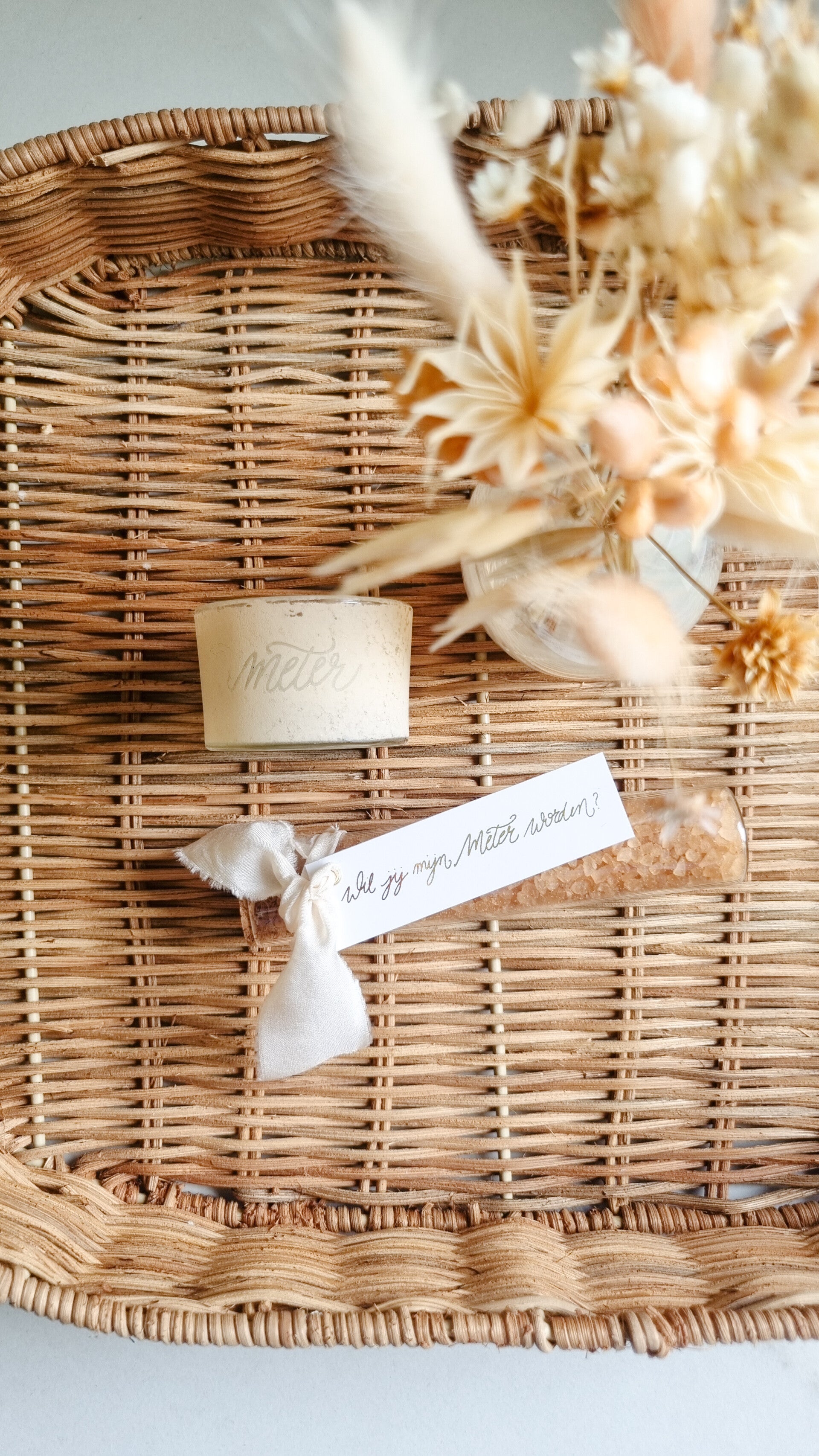 - Beige vaasje met droogbloemen. Optioneel gravure op het vaasje.