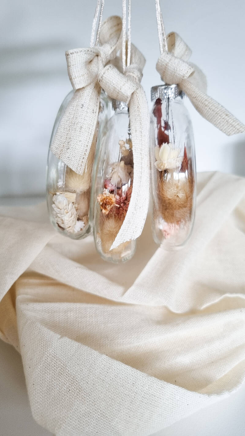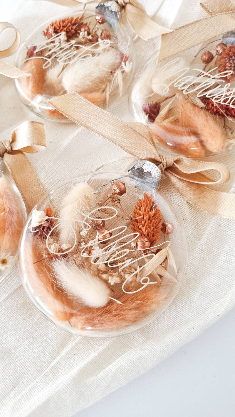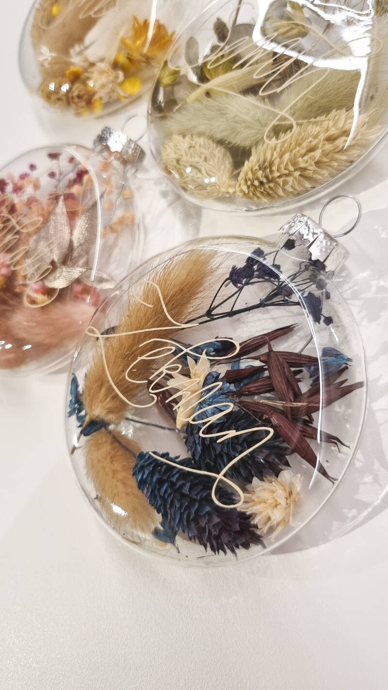 - Een glazen kerstbal gevuld met droogbloemen in een kleur naar keuze.