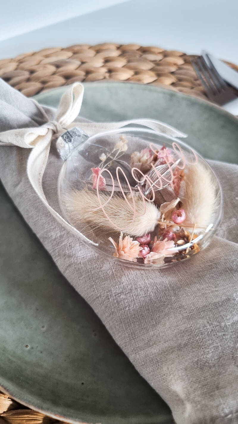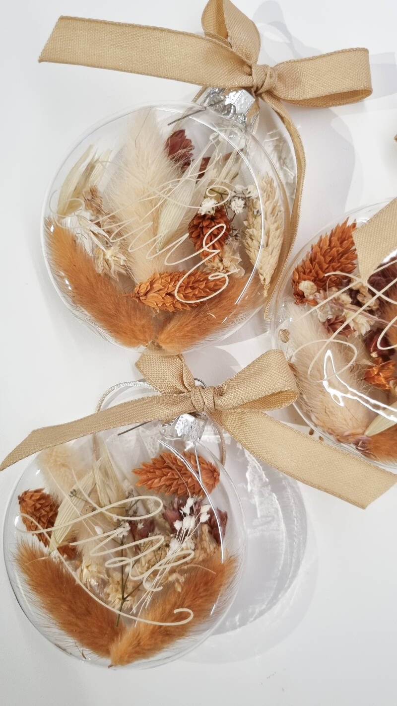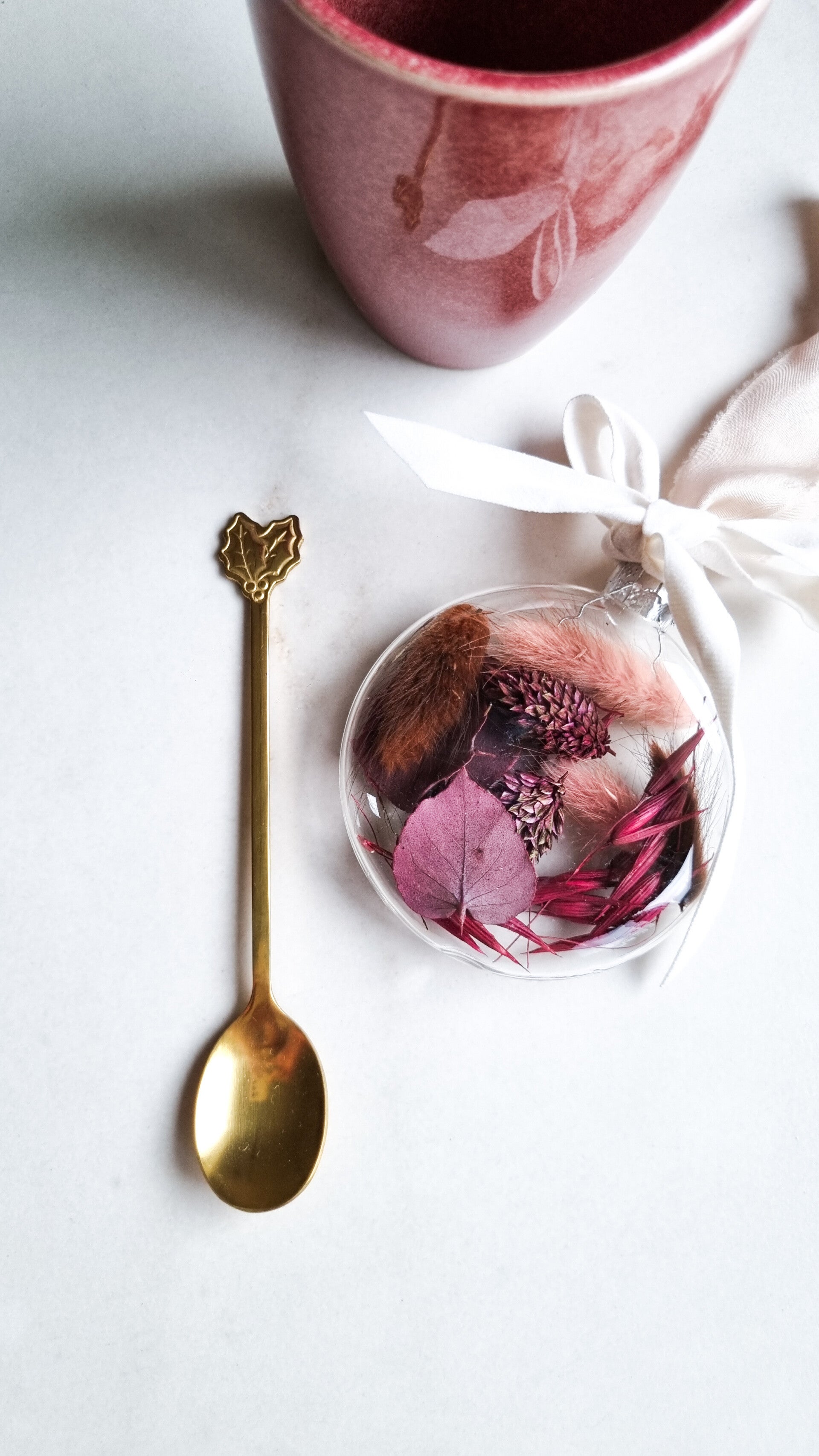 - Een glazen kerstbal gevuld met droogbloemen in een kleur naar keuze.