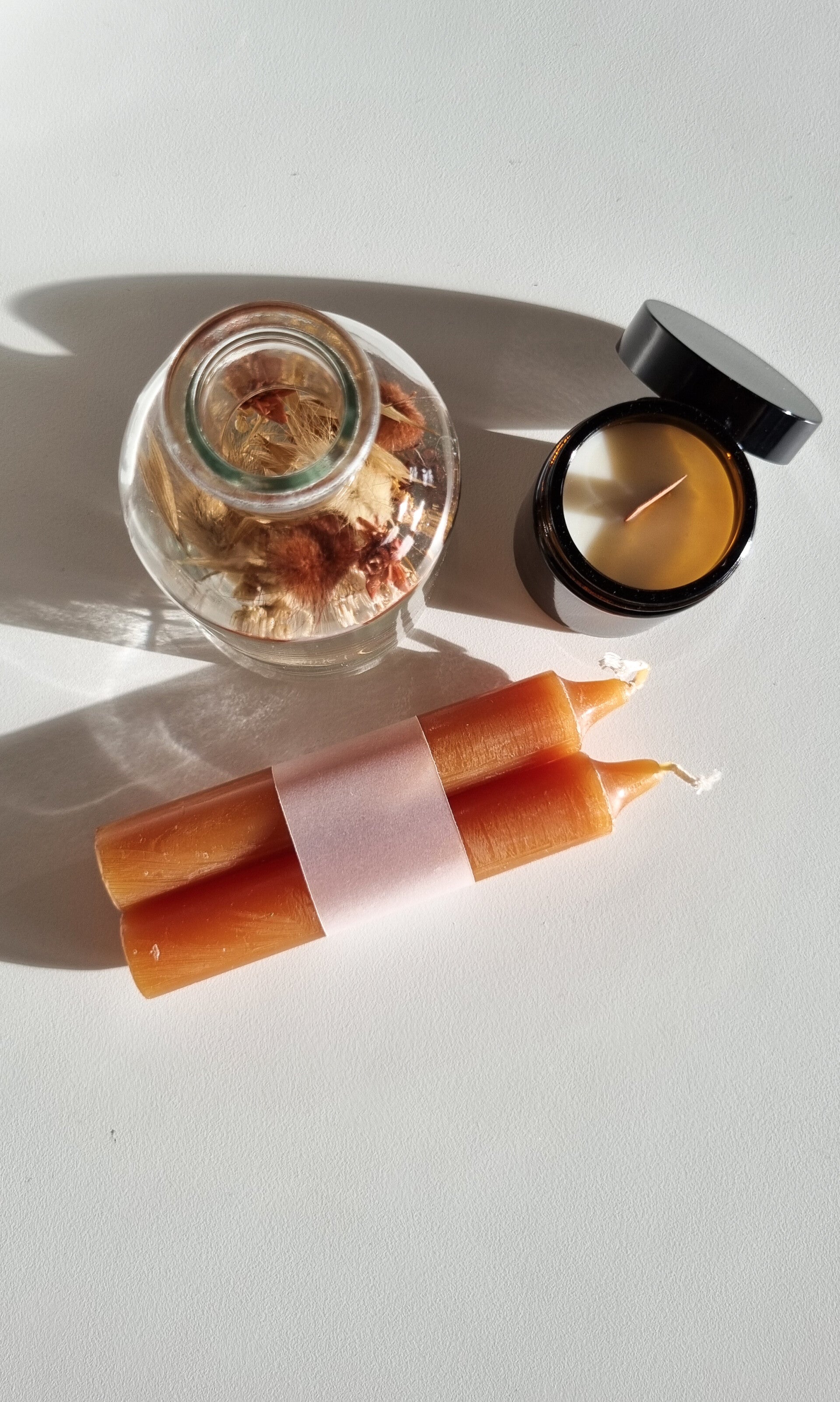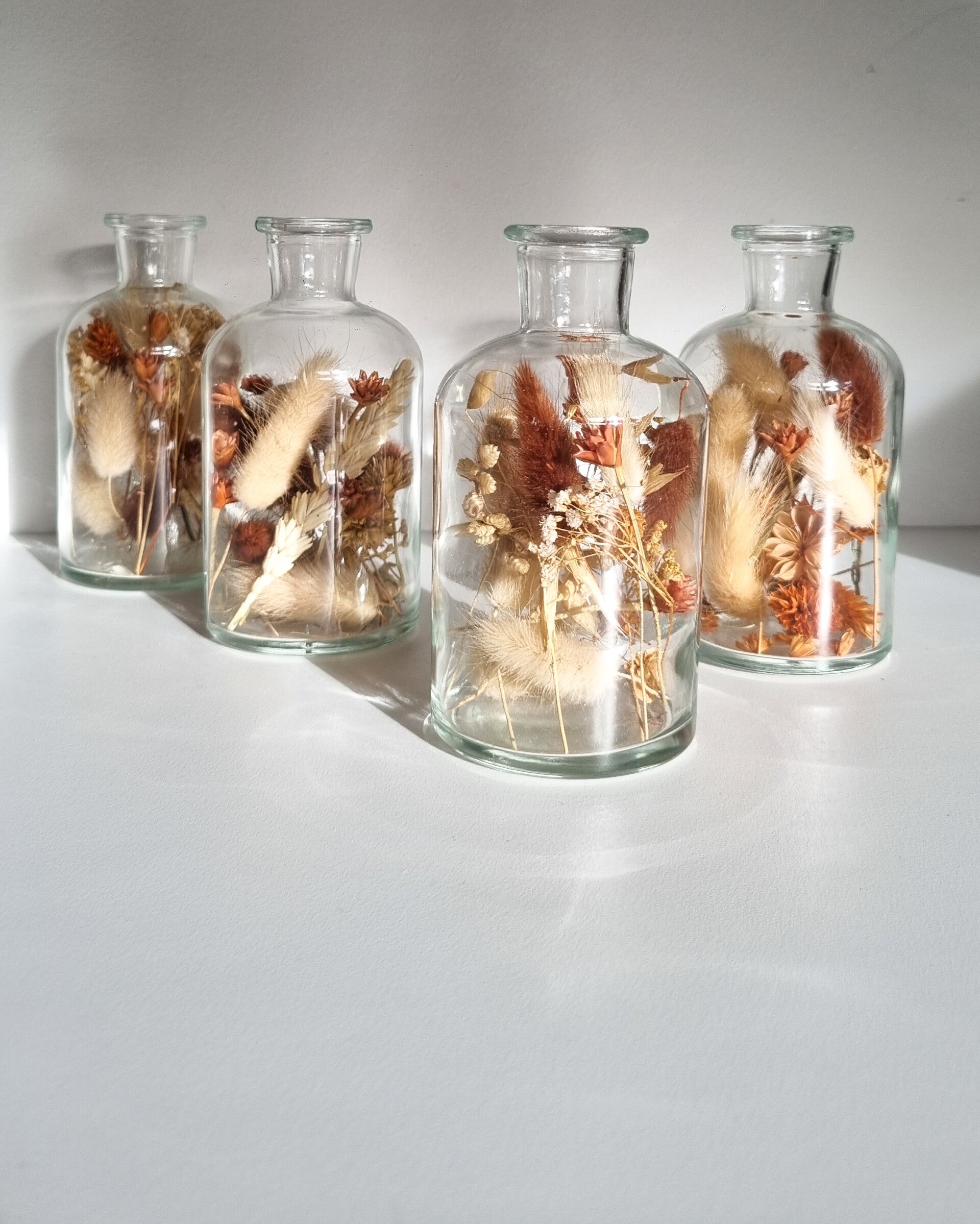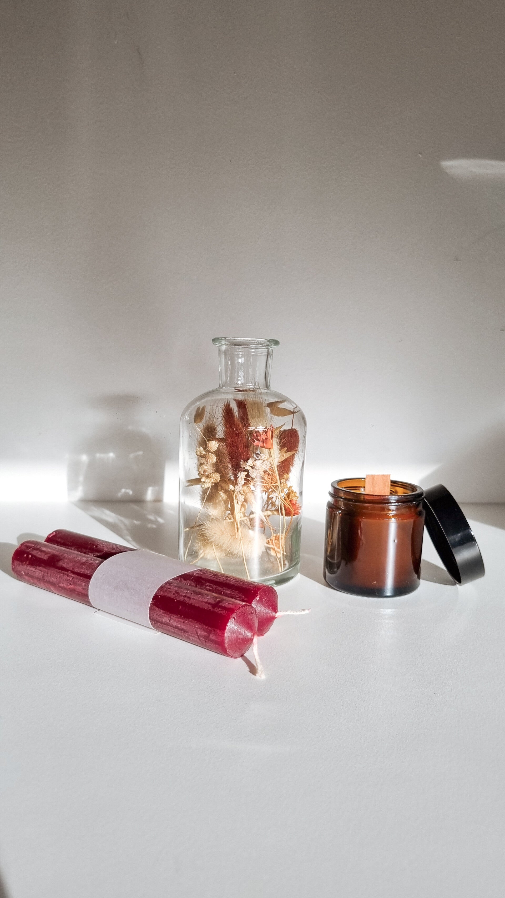 Breng wat kleur in jouw interieur met dit tijdloze vaasje / kaarsenhouder gevuld met herfstkleurige droogbloemen incl. 2 dinerkaarsen.