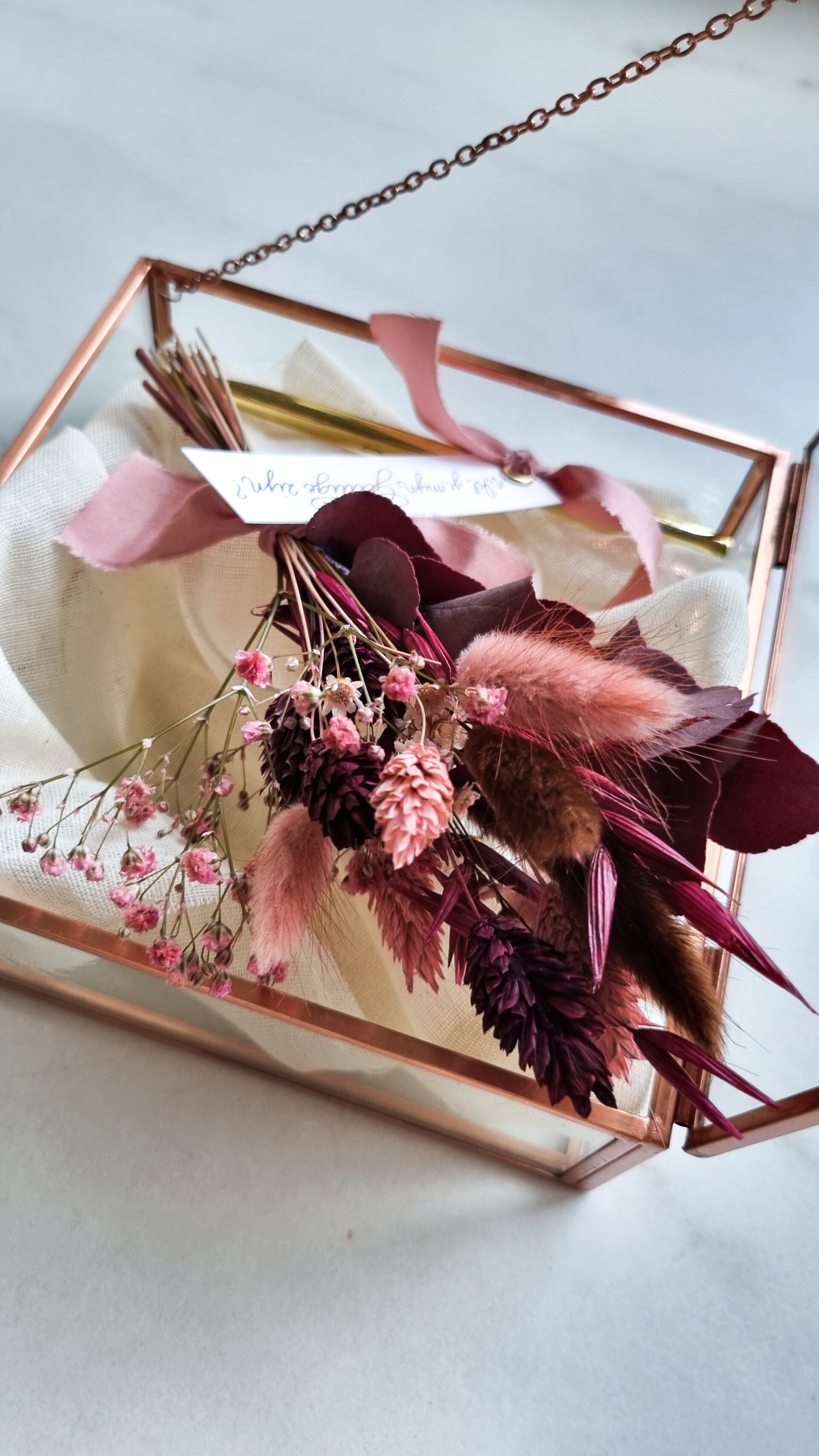 - Small Boeketje droogbloemen in kleurentint naar keuze, afgewerkt met zijden lint in een bijpassende kleur.