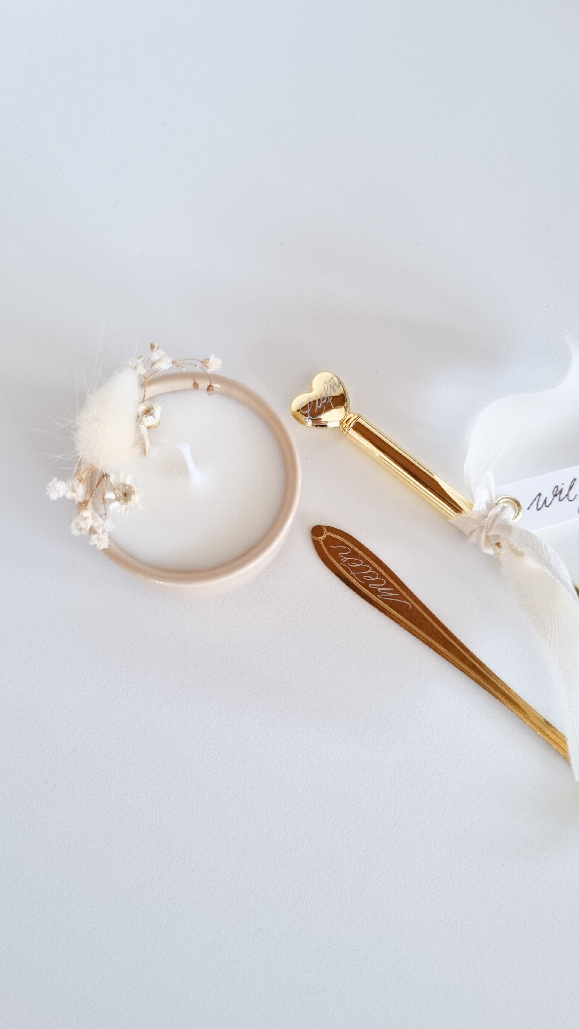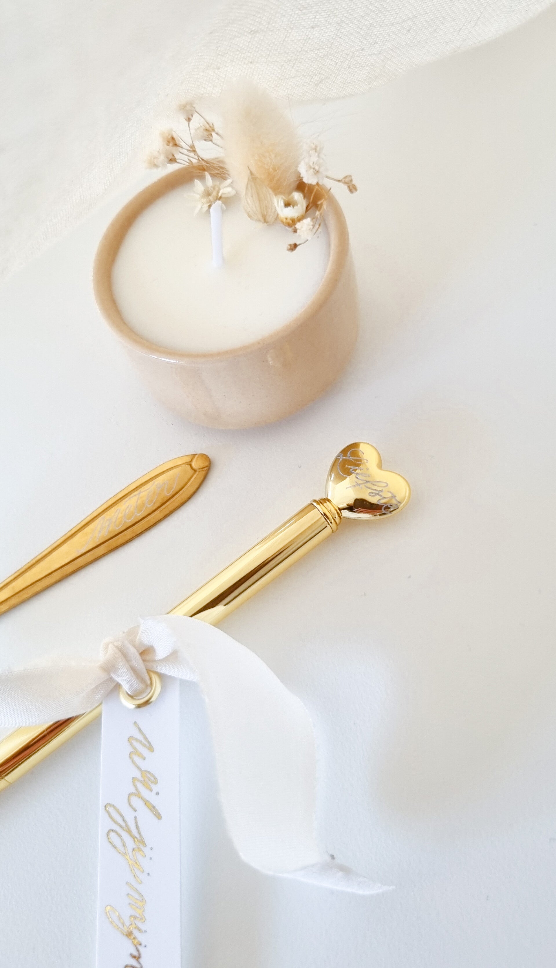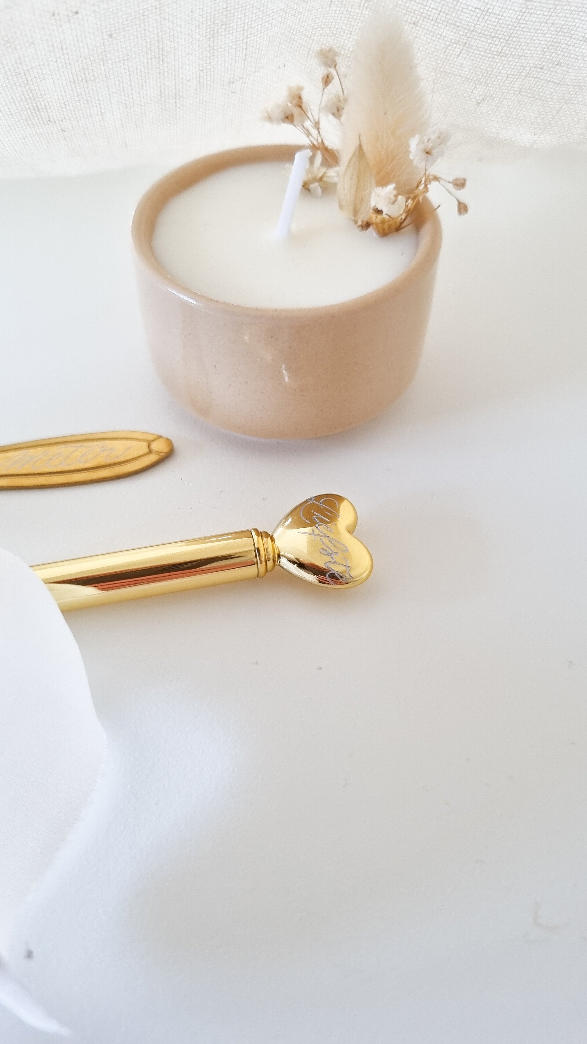 - Beige kaarsje met droogbloemen.