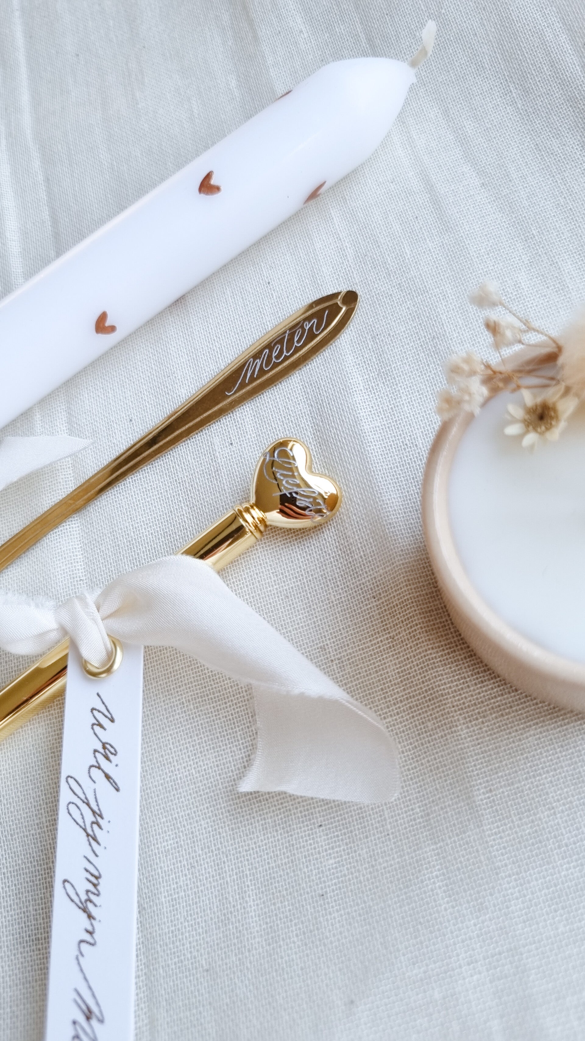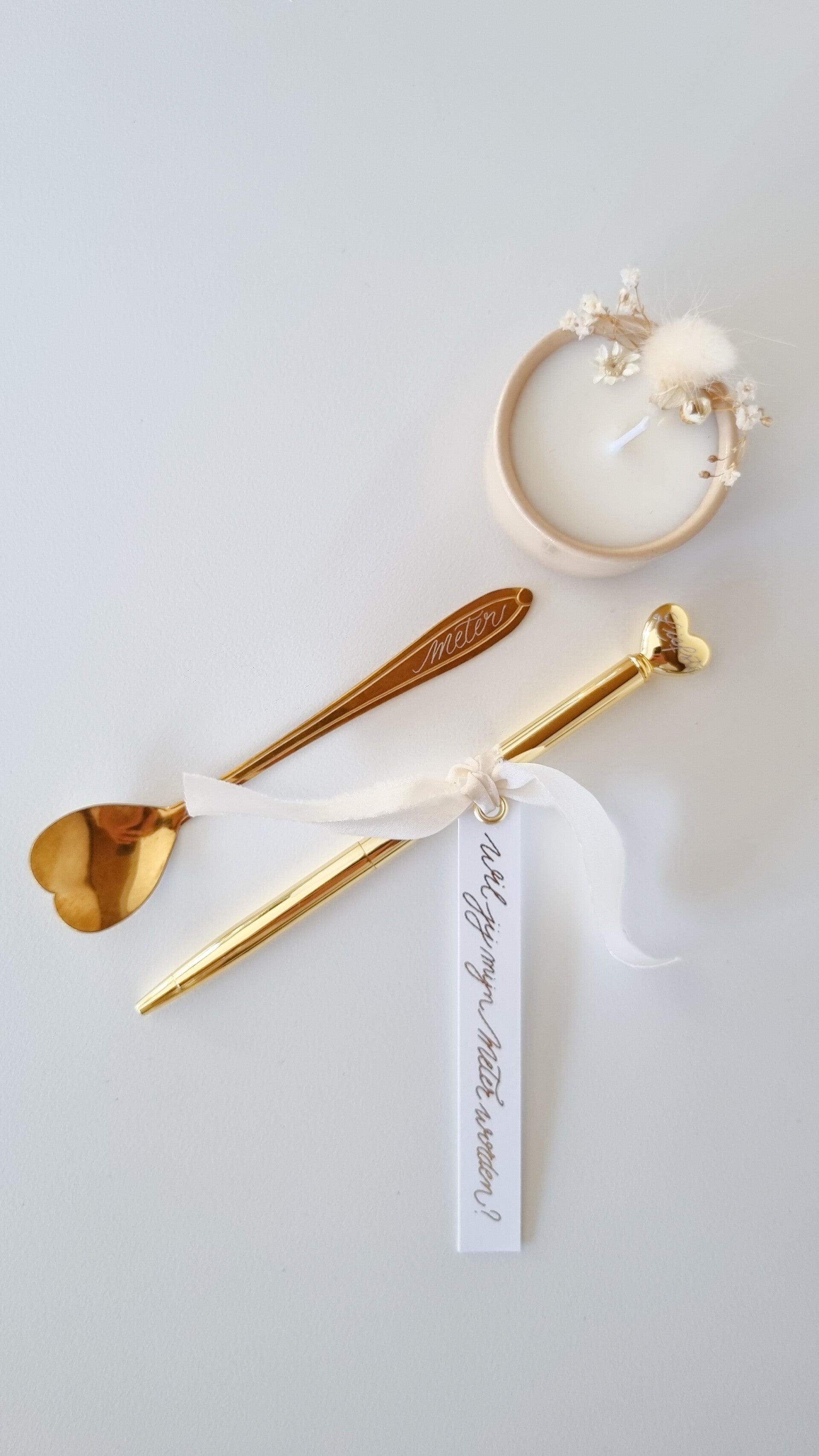 Deze love box is gevuld met een beige kaarsje afgewerkt met deoogbloemen, een balpen in goud of rosé afgewerkt met een hartje bovenaan en een gouden lepeltje met labeltje en lint.
